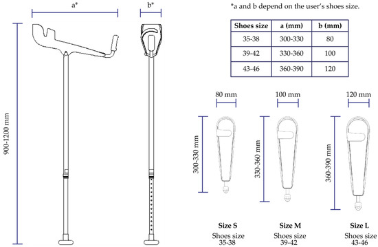 As for the dimensioning, the rod has a height adjustment between 900 mm and 1200 mm, while the support has three different sizes (S, M, L)—which differ in width—for each of which is possible a further adjustment of the length of the handle. For each size, there is a range of measures based on the individual’s shoe size (the length of the foot corresponds to the length of the forearm), Figure 8.
