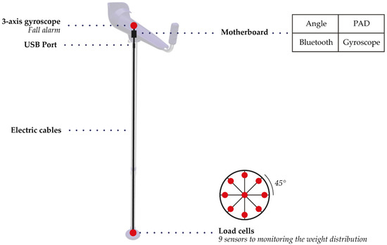 A matrix composed of nine load cells—which acts as a weight distribution sensor—is positioned in a special hollow inside the tip. The matrix is also connected to the gyroscope and the accelerometer to return a more precise data analysis [10].
