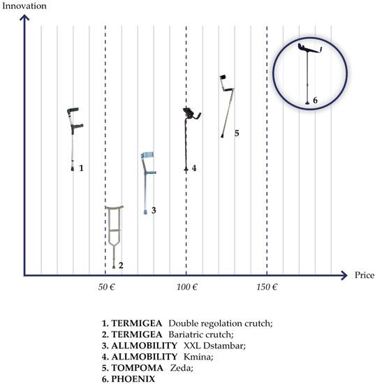 It would be very important to analyze the product through a physical prototyping using Additive Manufacturing [16,17,18,19,20]. Then, relying upon the initial budget hypothesis to carry out a cost analysis, in order to understand what the cost of the product could be and a possible sale price. Finally, it was studied how the product could be positioned on the market. According to the analysis of costs and to sales figures of crutches for chronic patients, it has been hypothesized at a sales cost of around €174, higher than the price of other crutches on the market, but acceptable for the technological innovations inside of it (Figure 15).