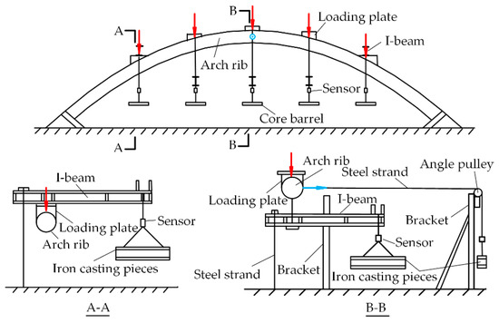 As shown in Figure 1, the experimental loading apparatus was fabricated to apply horizontal and vertical loads simultaneously. Five sets of loading apparatus were set at equal intervals along the arch span respectively to apply in-plane point loads, and a set of horizontal loading devices was arranged at arch vault to apply the out-plane point load. For applying vertical loads, lever method was adopted to enlarge the gravity action of iron casting pieces, as shown in the A-A profile. A fixed pulley was used to transform gravity action into a horizontal point load, as shown in the B-B profile.