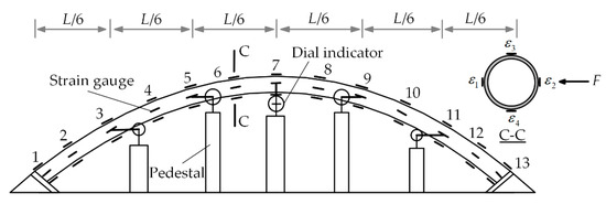 As shown in Figure 2, in total, thirteen measuring sections 1–13 were set equally spaced along the arch span. Around each section, four strain gauges (numbered from ε1–ε4) were placed on the outer surface of the steel tube to monitor longitudinal strains. Besides, dial indicators were distributed at spans L/6, L/3, L/2, 2L/3 and 5L/6 (Sections 3, 5, 7, 9, 11 and 13) to record both horizontal and vertical displacements.