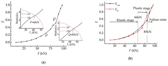 By calculating GSED values with strains of each measured point according to Equations (1)–(3), it can directly model the stressing state mode of the arch under spatial loads. Thus, the E-F curve is plotted to describe the working characteristics of the arch model during the whole loading process, as shown in Figure 3a. To distinguish the first characteristic load in the curve, the M–K criterion is applied to achieve the intersecting point of the UF and UB curves based on the sequence of {Ej,norm} from 0 kN to 97 kN. As for the second characteristic load, the sequence {Ej,norm} is from 66kN to 97 kN. Hence, two characteristic loads, P (66 kN) and Q (85 kN), are obtained. According to the two loads, the structural stressing state curve of the arch model is directly divided into three different stages. Before load P, the curve presents steady changes with load increase, indicating that the arch is basically in the linear-elastic working state in this stage. After load P, the arch model is in the elastic-plastic working state due to the local plastic development of steel tube. According to the natural law from quantitative change to qualitative change, characteristic load Q is detected, whereas thereafter a trend of relatively sharper increase of the E emerges and the arch enters the unstable working state until its finally failure at ultimate load (97 kN).