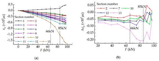 As shown in Figure 4b, the ∆Ej-F curves of some typical sections are plotted. It shows that curves of some sections, like Sections 1 and 3, have little increments during the whole load process, and the fluctuating ranges of these curves are not obvious enough after 85 kN. By comparison, the curves of typical sections, like Sections 7 and 13, show an obvious increasing trend from 66 kN to 85 kN and great increments after 85 kN, illustrating the important qualitative change of stressing the state mode of the arch model. Hence, from the perspective of experimental strains, it can evidently embody the leap change of the arch’s stressing state mode after the failure load.