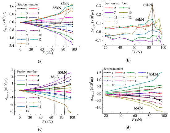 Figure 6 shows the changing features of the arch model’s stressing state submodes for bending moments, as well as the corresponding characteristic parameters ∆εM-out and ∆εM-in. Before 66 kN, the developing trends of both εM-in and εM-out are stable with light undulation. The obvious leap at about 75 kN (before failure load at 85 kN) in Figure 6a,b demonstrates that for the in-plane bending moment, the mutation characteristic may happen before failure load. This phenomenon is the same as the change characteristics embodied in Figure 3b. It can be seen from Figure 6c that the obvious increments after 85 kN greatly reflect the leap characteristic of the stressing state mode at failure load, especially the typical Sections 7 and 13.