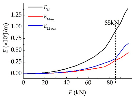 Figure 7 illustrates the generalized energy densities for internal forces under loads. It shows that EN corresponding to the effect of axial force are significantly higher than EM-in or EM-out, while the values of EM-in and EM-out are close to each other. Due to the weaker out-plane stiffness than the in-plane one, EM-out have great values and effect the working behavior of the arch under small out-plane loads. Therefore, the failure of the arch is mainly controlled by out-plane factors, as well as the change characteristics embodied by them at failure load.