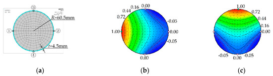 First of all, the software ANSYS was used to construct the FE model of arch’s cross section and meshed the section model with element Shell 181, as shown in Figure 8a. The radius of the cross section (R) is 60.5 mm and the thickness of steel tube (d) is 4.5 mm. In the coordinate system (x,y), built in the FE model, the coordinate (xj,yj) corresponds to j-th element node. As known quantities, the deflections of controlled points 1~4 are correspondent with strains ε1~ε4. Similar to the calculation of common shape functions [31,32,33], the discrete weighting functions N1~N4 are obtained based on four controlled points. Take N1 for example, applying a unit displacement at point 1 while points 2~4 are fixed to restrict rigid displacements, so N1 is formed by static calculation and extracting the function values from each element node, as shown in Figure 8b. N3 is also depicted in Figure 8c. Due to the central symmetry of the section shape, N1 is in rotational symmetry with N3.
