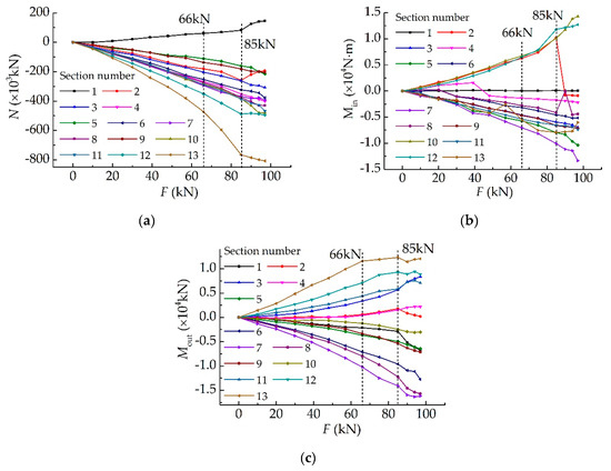 As shown in Figure 10, the developing trend of internal forces for axial force N and in-plane/out-plane bending moments Min/Mout are plotted to reflect the changing characteristics of the stressing state submodes. Figure 10a shows that the maximum value of the axial force occurs at Section 13 with load increase, as well as great bending moments. Before 85 kN, the curves basically keep the growth trend unchanged while, thereafter, they change to another trend with obvious turning points. Besides, because of the initial geometrical imperfection (arch axis’s asymmetric deviation) of the arch, the distribution of F especially at arch feet is considerably asymmetrical. As for Figure 10b, in-plane bending moments show great values at arch vault and near arch feet with opposite directions. Some curves exhibit a little fluctuation and some others show the transition at 85 kN. As reflected in Figure 10c, the distribution of Mout shows the obviously essential change after 85 kN in some typical cross sections, e.g., Sections 3, 7, and 8.