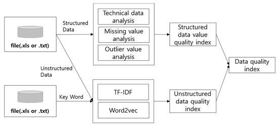 In the era of the Fourth Industrial Revolution, more and more people and things are connected to the internet, and big data are being produced explosively [1]. In order for industries to improve the competitiveness of products and services, big data are explosively being produced and utilized, and the government also encourages the creation of new job openings throughout the open and private sectors, as well as the utilization of public data [2]. The amount of digital information produced and circulated globally is expected to be 90 zettabytes in 2020 [1], and digital information in Korea is expected to increase by an annual average of 57% [3,4]. Digital information can be classified into unstructured data, such as image and voice, and structured data. Unstructured data account for an overwhelming proportion of 92% of the total amount of information, and structured data account for 8% [3]. Companies are focusing on enhancing the competitiveness of products and services using artificial intelligence (AI) technology, and machine learning, which is a core technology of artificial intelligence (AI), is a way for computers to acquire high-level characteristics through self-learning data. Securing high-quality big data is becoming an important asset to enhance corporate competitiveness. Also, with the advancement of data technology, the value of data utilization becomes higher; thus, systematic quality control is required. Until now, the quality control of data concentrated on structured data, with a very weak demonstration for unstructured data. Therefore, it can be said that a systematic study is needed to calculate the quality index of structured and unstructured data.