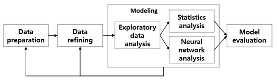 The data analysis methodology includes Knowledge Discovery in Database (KDD) and CRISP-DM (CRSS Industrial Standard Process for Data Mining) [25]. In this study, the existing methodology was customized. The big data analysis methodology of Korea Data Agency (KDA) is a hierarchical process model with three phases: Phase, Task, and step. The top level consists of analysis planning, data preparation, data analysis, system implementation, evaluation, and deployment [26]. Analysis planning is a step in understanding the business, identifying the problems of the domain, and determining the scope of the project. Data preparation is the step of preparing the datasets necessary for data analysis to develop models that reflect business requirements. Data analysis is the step of analyzing the data to achieve the goals established in the analysis planning stage using the fixed and unstructured data. System implementation is the step of implementing the results of exploratory data analysis or data analysis model as a system. The evaluation and deployment steps assess whether the objectives of the analysis planning phase are met, and they end the big data analysis project. KDD is a data mining methodology for discovering knowledge in a database. It is composed of data selection, data preprocessing, transformation, data mining, and interpreting/evaluation [27]. CRISP-DM is a hierarchical data mining methodology developed by many companies including Teradata, NCR, SPSS, and Daimler AG, which started in 1996 in the European Union ESPRIT project [28]. CRISP-DM consists of business understanding, data understanding, data preparation, modeling, evaluation, and deployment stages. Currently, many companies implement big data analysis methodology. The methodology applied to this study was customized to suit the data profiling of the big data analysis methodology, KDD, and CRISP-DM methodology of KDA. The methodology consisted of data preparation, data refining, modeling, and model evaluation, as shown in Figure 2.