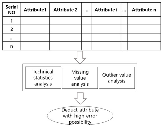 Outlier refers to a value apart from other observation values [26,29], and, in the case of 3 standard deviations, it is regarded as an extreme value [30]. This study used it to diagnose the data quality of numerical, date, and categorical data types. A flowchart for extracting attributes of the data value quality diagnosis target is shown in Figure 3.