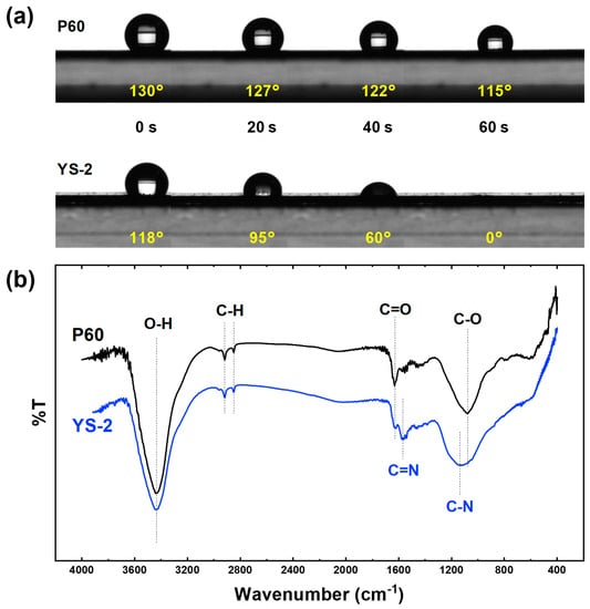 (a) Contact angle changes of two electrodes fabricated with P60 and YS-2 as function of time and (b) FT-IR spectra of P60 and YS-2.