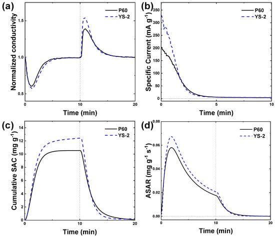 Membrane capacitive deionization (MCDI) performances using P60 and YS-2 electrodes; (a) normalized conductivity profiles; (b) specific current (mA g−1); (c) cumulative salt adsorption capacity (SAC, mg g−1); and (d) average salt adsorption rate (ASAR, mg g−1 s−1) with time of P60 electrode (black) and YS-2 electrode (blue). All graphs were the result of the nearest set to the average value.