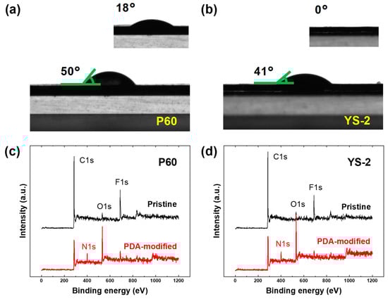Contact angle images of (a) P60 electrode and (b) YS-2 electrode after polydopamine (PDA) modification (upper-right images were taken after 3 s) and XPS spectra of (c) P60 and (d) YS-2 as pristine (black) and PDA-modified electrodes (red).
