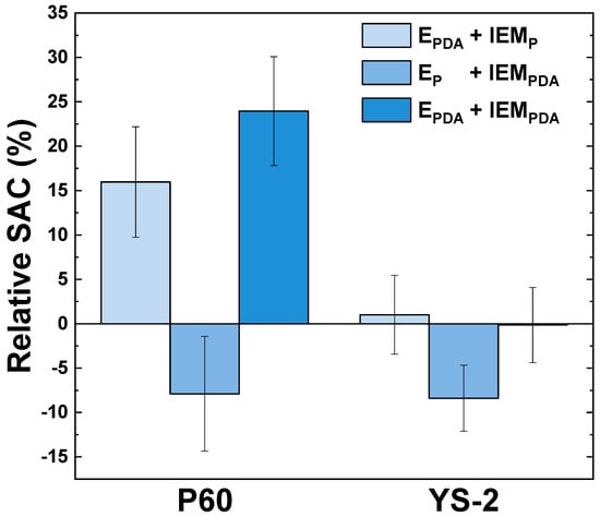 Figure 4 shows the relative SAC in MCDI for three combinations of the electrode and IEM: PDA-modified electrode and pristine IEM (EPDA + IEMP), pristine electrode and PDA-modified IEM (EP + IEMPDA), and PDA-modified electrode and IEM (EPDA + IEMPDA). The SACs were summarized in Table 3. Relative SAC was calculated from these SACs by subtracting from and dividing by the SAC of the MCDI (refer to Table 2) with a pristine electrode and IEM. As shown in Figure 4, the PDA-modified P60 electrode significantly increased the SAC by approximately 20%, while the changes in SAC using the YS-2 electrode before/after PDA modification were insignificant. The probable explanation is that the PDA modification of the hydrophobic P60 electrode had a large effect on the desalination performance, while the YS-2 electrode with already good wettability did not get affected by additional hydrophilic modification.