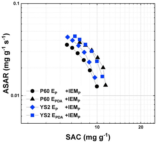 To evaluate the effects of hydrophilic electrodes on desalination performance from the thermodynamic and kinetic points of view, a CDI Ragone plot was drawn, as shown in Figure 5. A shift in to the right means an improvement in the SAC and in the upward direction means a fast rate of salt adsorption (i.e., ASAR) [35]. As seen in Figure 5, YS-2 values (blue points) were positioned in a higher region, indicating better kinetics than P60 (black points) both before and after the PDA modification. After PDA modification, each plot shifted higher and to the right, indicating a higher and faster desalination performance. The improvement in SAC with the P60 electrode was larger than that with the YS-2 electrode, which is consistent with the larger increase in capacity (Figure 4). The results in Figure 4 and Figure 5 support the theory that the use of hydrophilic electrodes could improve the desalination performance of MCDI.