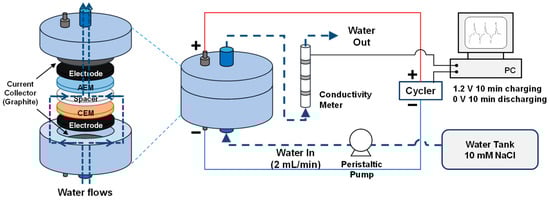 Membrane capacitive deionization (MCDI) is a modification of CDI with an additional ion exchange membrane (IEM) equipped onto each electrode (an anion exchange and a cation exchange membrane). Adding IEMs in CDI has improved desalination performance. Lee et al. [18] reported that MCDI increased the ion removal rate by approximately 20% when using an activated carbon cloth as an electrode and a commercial IEM. Li et al. [19] demonstrated an improved salt removal efficiency of approximately 37% in MCDI when using graphite-based electrodes incorporated with single-walled carbon nanotubes and IEM. An additional 5% salt removal efficiency was achieved by applying higher voltages of up to 1.6 V. Placing the IEM in front of the electrode also significantly increased the charge efficiency of the salt ion adsorption/desorption [20,21] due to the inhibition of co-ion repulsion affected by the IEM acting as a charge barrier and the additional ion storage in the interparticle spaces of the electrode [22,23,24].