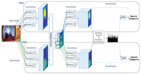 Let us consider a set of training RGB images of size acquired by a portable digital camera mounted on a lightweight shield worn by the user, and connected via a USB wire to a laptop processing unit, where , and , c) refer the number of rows and columns of the images. Let us assume also is its corresponding label vector, where represents the total number of targeted classes. In a multi-label setting, the label is set to 1 if the corresponding object is present; otherwise, it is set to 0. Figure 1 shows a general view of the proposed M-CSVM classification system, which is composed from branches. In next sub-sections, we detail the convolution and fusion layers, which are the main ingredient of the proposed method.