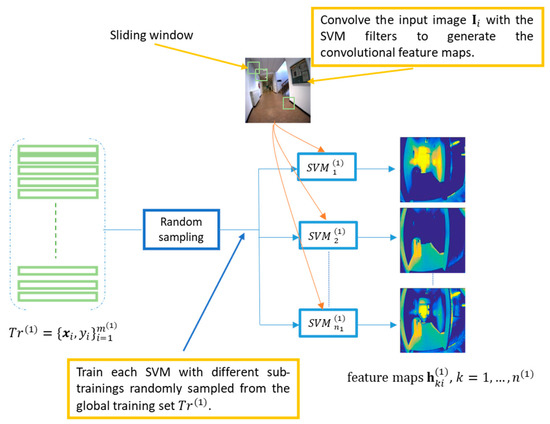 Next, we learn a set of SVM filters on different sub-training sets of size randomly sampled from the training set . The weight vector and bias of each SVM filter are determined by optimizing the following problem [39,40]: