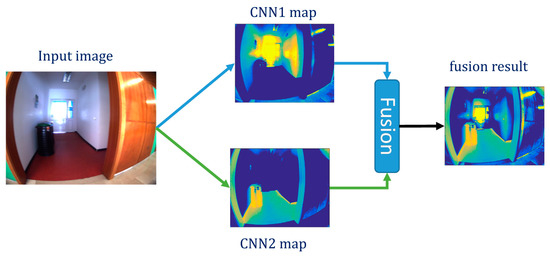 Example of fusion of output maps of two convolutional neural networks (CNNs).