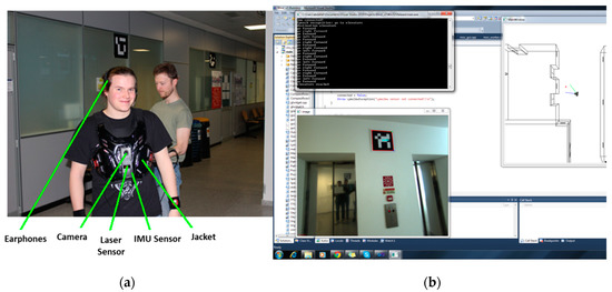 Overview of the system developed for visually impaired (VI) people. (a) Camera mounted on the chest, tablet, and headphones for voice communication; and (b) graphical interface.