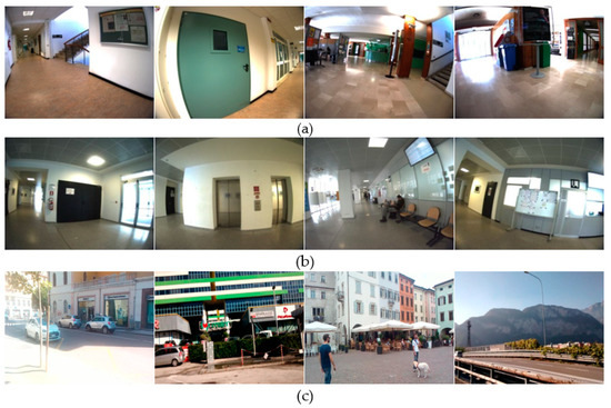 The first and second datasets acquired by this system are composed of images of size 320 × 240 pixels. Both datasets have been taken at two different indoor spaces of the faculty of science of University of Trento (Italy). The first dataset contains 58 training and 72 testing images, whereas the second dataset contains 61 training images and 70 testing images. On the other the side, the third dataset is related to outdoor environment and was acquired over different locations across the city of Trento. The locations were selected based on their importance as well as the density of people frequenting them. The dataset comprises two hundred (200) images of size 275 × 175 pixels, which were equally divided into 100 training and testing images, respectively. It is noteworthy that the training images for all datasets were selected in such a way as to cover all the predefined objects in the considered indoor and outdoor environments. To this end, we have selected the objects deemed to be the most important ones in the considered spaces. Regarding the first dataset, 15 objects were considered as follows: ‘External Window’, ‘Board’, ‘Table’, ‘External Door’, ‘Stair Door’, ‘Access Control Reader’, ‘Office’, ‘Pillar’, ‘Display Screen’, ‘People’, ‘ATM’, ‘Chairs’, ‘Bins’, ‘Internal Door’, and ‘Elevator’. Whereas, for the second set, the list was the following: ‘Stairs’, ‘Heater’, ‘Corridor’, ‘Board’, ‘Laboratories’, ‘Bins’, ‘Office’, ‘People’, ‘Pillar’, ‘Elevator’, ‘Reception’, ‘Chairs’, ‘Self Service’, ‘External Door’, and ‘Display Screen’. Finally, for the last dataset, a total of 26 objects were defined as follows: ‘People’, ‘Building’, ‘Bar(s)’, ‘Monument(s)’, ‘Chairs/Benches’, ‘Green ground’, ‘Vehicle(s)’, ‘Stairs’, ‘Walk path/Sidewalk’, ‘Fence/Wall’, ‘Tree(s)/Plant(s)’, ‘Garbage can(s)’, ‘Bus stop’, ‘Crosswalk’, ‘River’, ‘Roundabout’, ‘Pole(s)/Pillar(s)’, ‘Shop(s)’, ‘Supermarket(s)’, ‘Pound/Birds’, ‘Underpass’, ‘Bridge’, ‘Railroad’, ‘Admiration building’, ‘Church’, and ‘Traffic signs’. Figure 6 shows sample images from each dataset.