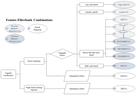 The results from previous works are reported for direct comparison. The methods applied are, by following the same nomenclature (see also Figure 2), (1) the log-scale CCs; (2) the linear CCs; (3) the classic definition of MFCCs; (4) the MFCCs with a cut-off frequency ; and, (5) the MFCCs with a cut-off frequency from [21]; the three proposed Mel-Modified Cepstral Coefficients (MMFCCs), i.e., the so-called (i) ECO-MMFCCs; (ii) MO-MMFCCs; and, (iii) LO-MMFCCs, from [22], plus the Bark-scale based (iv) BFCCs; finally, the novel features here presented, (I) the GTCCs and (II) the TECCs.
