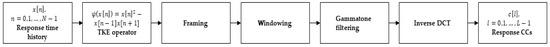 From this definition, the magnitude of the frequency transform is used for the extraction of the CCs. The process is the same as described in Section 2.2. and represented in Figure 1, except for the use of TKE operator and of the Gammatone filter in lieu of acceleration time histories and triangular filters. Noteworthy, the TKE operator can be approximately seen as a high-pass Volterra system, in both continuous- and discrete-time. In the latter case, as used in this work, the operator might be further approximated as the product of an appropriate finite impulse response (FIR) filter and of the signal local (along time) mean. This approximation is only legitimate if the local mean is much larger than the variance of the signal system; however, this error is much more evident in speech signals, which are commonly strongly non-stationary, rather than in the mechanical vibration of structures.