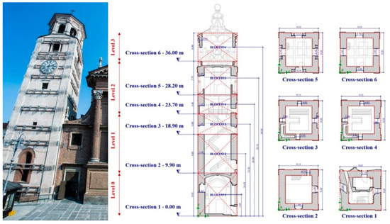 Structural scheme of the bell tower (to the right in the image) and picture of its front view (to the left); autofrettage interventions are clearly visible on the external façades.