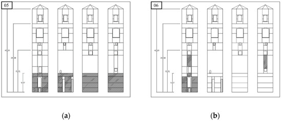 Cases 01 to 04 only present a 5% reduction of along one of the four stories of the structure, on all façades. Cases 05–10 are realistic post-earthquake scenarios, which are based on the Authors’ previous experience and intended to model typical damage pattern encountered in similar cases; they are portrayed in Figure 6. Case 11 is a global stiffness reduction of 10% throughout the whole structure. Cases 12–14 emulate damage to the linking with the adjacent cathedral, with 50% of the spring stiffness. Finally, four ‘unaltered’ scenarios were also accounted for: as for case 11, a global variation of was applied; specifically, a reduction/increase equal to 1% and 0.25%. This was intended to simulate statistical fluctuations of the material properties, which cannot be unequivocally related to the presence of occurring damage.