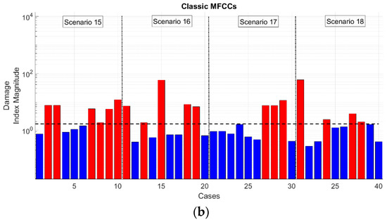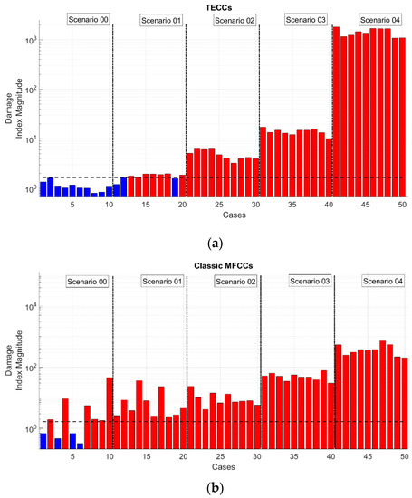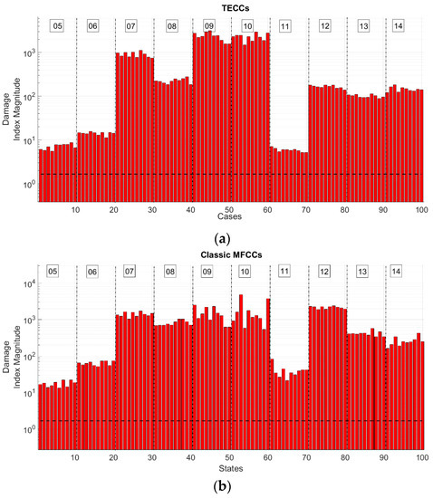 - the TECCs present a strong reduction of the order of magnitude of the Damage Index (DI) with respect to MFCCs and similar options, in absolute terms; this does not affect the damage detection algorithm, as the relative distance between the ‘normality’ model and the damaged cases remains and seems even to increase;
