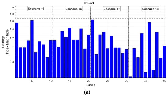 In interpreting the data, one must consider the different definition of ‘damage’ between the two numerical and the experimental case studies. The Fossano bell tower and the HAR prototype wing behave linearly in both damaged and pristine conditions; again, the difference between the two is only a matter of shifting natural frequencies. The experimental data have a completely different ‘meaning’ of damage, as here, differences in mass and stiffness are accounted as different operational conditions and the distinction between damaged and undamaged response lies solely on the presence of nonlinearities. In this latter case, the TECCs proved to be the only feature able to reach a 0% type 1 error in the test set, but only in spite of a relatively high type 2 error percentage, only surpassed by the recently proposed MO- and LO-MMFCCs. Nevertheless, a closer inspection of the several damaged and undamaged configurations allows for highlighting that this error is clustered in only three scenarios, respectively, cases 10, 15, and 16. Case 10 is the one with the slightest nonlinearity and, thus, is the most challenging to detect. The algorithm also struggled for cases 15 and 16, where changes in the frame’s mass are involved. On the other hand, all of the undamaged scenarios are recognised as such by means of the TECCs, while classic MFCCs generate some misclassifications for case 5 (which is the one with the largest stiffness reduction close to the base of the frame, where such structural changes have the most impact in the vibrational response).