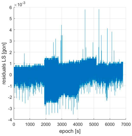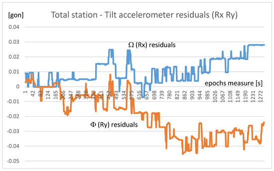 The residuals between the tilt measurements from the accelerometer and the total station show values of a few hundredths of a gon (Figure 8). Note the great improvement of the calibrated data over the “raw” data with uncalibrated accelerations. The accuracy is improved by more than one order of magnitude—mean and standard deviation of the residuals are shown in Table 5.
