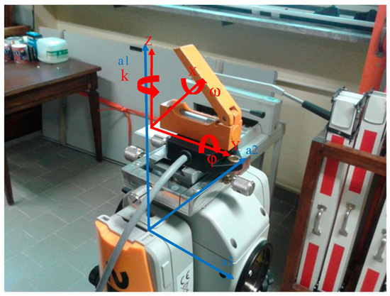 In fact, due to a few unavoidable mechanical misalignments, the accelerometer axis system (X, Y, Z) was not parallel to that of the total station (a1, a2, and a3). We labeled these angular misalignments with lowercase Greek letters: ω, φ, and, κ. Before performing this test, these values must first be estimated.