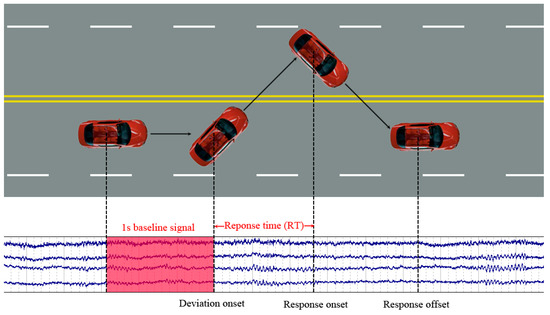 The event-related lane departure paradigm [2]. A complete trial consists of three steps: (1) deviation onset—the lane-departure event occurs, (2) response onset—the driver starts to steer the wheel back, and (3) the response offset—the car returns to the original cruising lane. Response time (RT) is defined as the time period between the deviation onset and the response onset. This study uses the 1 s baseline signal before the lane-departure event for predicting drowsiness according to the value of RT.