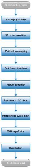 The general flowchart of our method is presented in Figure 3. Before data analysis, the acquired EEG records were processed using a 1-Hz high-pass and 50-Hz low-pass infinite impulse response filter to remove the noise and then down-sampled to 250-Hz to reduce the dimensions of the data. The power spectral activities of EEG signals were computed using FFT. To transform the EEG signal to a 2D image, we needed to address the following issues: (1) transforming the power spectrum of EEG signals to image values and (2) interpolating the points of the image data to a color image. The detailed approach is explained in the following sections.