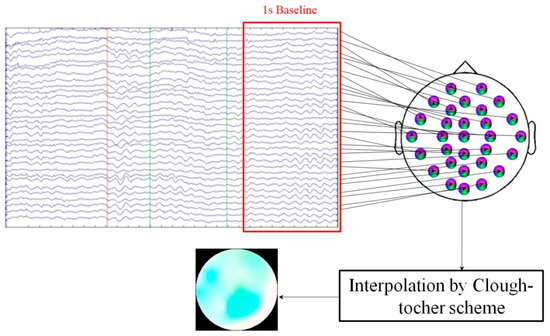 where is the normalized image pixel value, and is the magnitude of the frequency response in the dB. Next, we needed to interpolate the scattered image data points to a color image. Figure 5 illustrates the interpolation scheme of the EEG image. The finite element method, a numerical technique that is usually applied for the approximate solution of engineering problems that are difficult to solve analytically, was adopted to perform the interpolation task. The Clough–Tocher scheme was used to interpolate a 32 × 32 mesh from the 30 image data points [39]. In this study, the EEG electrodes were placed in accordance with a modified international 10–20 system, which means that the location corresponding to each image point is known. Three topographical maps corresponding to the three frequency bands of interest were acquired by the Clough–Tocher scheme. The three spatial maps were then merged to create a 32 × 32 color image. Figure 6 demonstrates several samples of the EEG image.