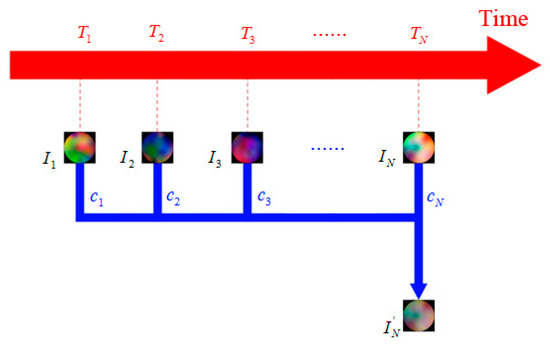 The schematic diagram of the temporal EEG image. is the single frame EEG image generated from the current trial. Temporal EEG image is acquired by linearly combining and its previous trials.
