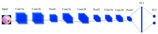 This study applies a CNN including six convolution layers, three max-pooling layers, and a layer to the classification of the input EEG image, as shown in Figure 8. A popular open source deep learning framework named Caffe is employed for implementing the CNN model [40]. The parameter setting of the overall CNN architecture is presented in Table 1. A set of filters is used to convolve the input EEG images for feature extraction. The convolved images are then subsampled by the max-pooling layer to derive compacted features. The convolution and pooling progress are repeated several times through CNN layers. The lower-level features of the input data are extracted via the early layers, and those features are collected in the later layers to hierarchically learn the higher-level features. Finally, the acquired high-level features are concatenated and passed into the fully-connected layer for the classification. The final prediction result is determined according to the output of the fully-connected layer. We only use the alert and drowsy classes in this study, so the output size of the fully-connected layer is 2 × 1.