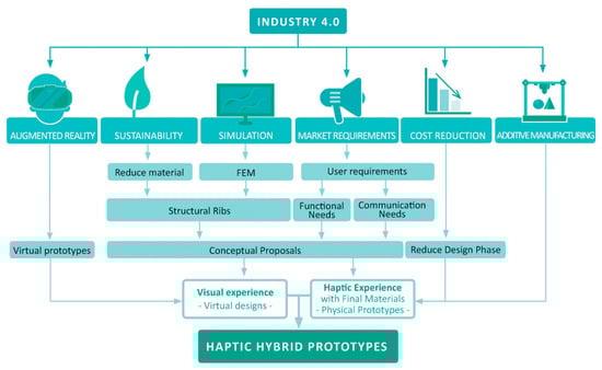 To approach the resolution of this problem, one of the most commonly used methods by design teams to get the user’s opinion before the manufacturing phase has been the creation of prototypes [22]. This is an economical and quick way to reproduce the shape of the product and be able to validate certain basic requirements [23]. Thus, the techniques developed in prototyping vary depending on the historical framework where increasing complexity in design processes and efforts to improve decision making leads to the creation of new approaches and techniques to support designers in order to improve product quality. This scenario has given rise to the appearance of hybrid prototypes (HP), defined as the simultaneous presence of a virtual representation, either through virtual reality (VR) or AR and physical support [24,25]. Thus, the application of these processes results in a reduction of time in the manufacture of prototypes and, therefore, of the conceptualization phase [26]. In addition, it allows the process to use fewer materials, produce less waste and consume less energy, achieving the same result [27,28].