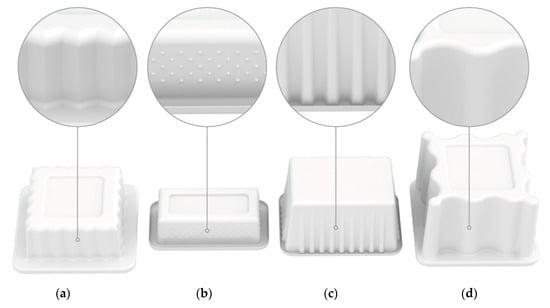 In addition, four types of packaging have been created for the purpose of carrying out the experiment, which, in turn, includes four different reliefs. Figure 3 shows the geometries used, where the model type A presents relief in the form of sawtooth, type B a dot pattern, type C ribs and type D undulations.