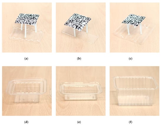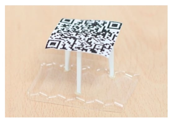 Accordingly, in order to make the samples that make up part of the proposed HHP, a wall of the thermoformed container was cut to remove only the reliefs designed on type A, B and D containers in Figure 3. As shown in Figure 6, a support with three legs was placed on the cut samples, which was used as a separator, at a distance of 35 mm, with the generated QR code, which was designed to touch the finishing sample without hiding the QR code from the camera. An effect of the superimposition of the virtual product on the hand was achieved on the screen.