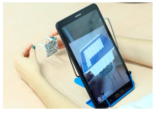 Physical finishing samples have been developed in this experiment using additive manufacturing and thermoforming techniques. Afterwards they were attached to a support, which includes the QR code, to allow manipulation of the samples while evaluating the virtual image. Also, although the AR program allows use of any digital device, we have worked with a 10.1 inch Samsung® Tab A 2016 Tablet with an IPS display with a maximum resolution of 1920 × 1200 was used to improve the functionality of the procedure.