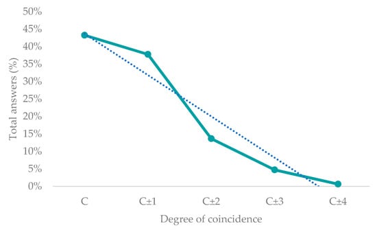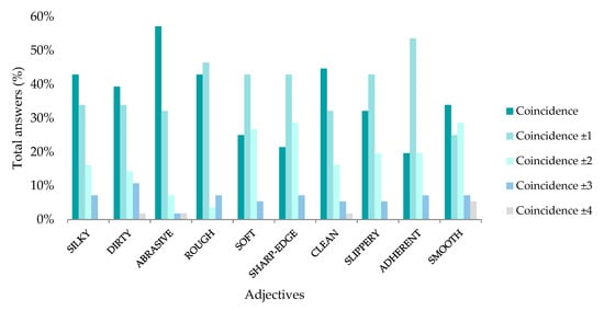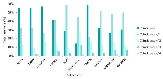 In a comparative evaluation between Figure 9 and Figure 10, it is observed that the total coincidences and the coincidences ±1 have increased in product B with respect to A for all the adjectives evaluated except for the term “rough”. Based on this, it should be noted that the maximum deviation between the maximum value reached in product A and the lowest in product B for the concept “rough” occurs for the coincidence ±1 and is 5.3%. This value in comparison with the increments that have experienced the rest of adjectives can be considered unrepresentative.