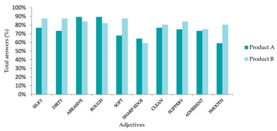 In order to analyses in a more detailed way the differences between the responses of products A and B, Figure 11 is carried out. It shows the sum of the percentages of total coincidence and ±1 coincidence for each product and compares these values reached in both products. In this way, it is observed that in both products the adjective “sharp-edge” reports the lowest values, below 65%. As commented, it is possible that the term leads users to evaluate the cut made to produce the sample shown and they do not evaluate the texture, so a clarification in the evaluation of this term or its substitution could produce higher values of success.