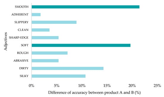 On the other hand, Figure 9 shows the results obtained in Table 1 as a percentage of responses. An overall analysis of the results shows that the deviation of ±3 and ±4 is reduced in comparison to the responses that present a greater similarity. Thus, of the 10 attributes studied, the answers in 5 of them present a total coincidence: silky, dirty, abrasive, clean and smooth. Among them, the adjective “abrasive” stands out, for which 57.1% of the participants coincided in their answers in both experiments. The minimum value of these terms is reached by the “smooth” attribute with 33.9%, which means a difference of 23.2% between these terms. This adjective is also the one that presents similar values between total coincidence, ±1, ±2 and ±3. This may be due to the fact that product type A presents angulated plane changes where the surface finish of the plastic material is intentionally non-abrasive, due to the lack of discontinuities that the product presents, to evaluate the degree of flatness of a piece is complex, with which the degree of dispersion of responses is higher.