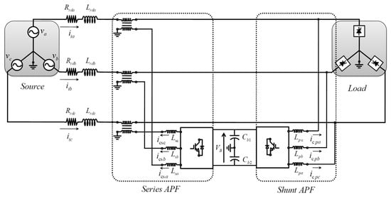 The schematic diagram of the UPQC is presented in Figure 1 [16,17,18], where the series and shunt APFs are used to improve the harmonics. The term , , and are the currents of the main electrical circuit that considers the source and load, which is supplied through phases a, b, and c, respectively; , , and are the resistances of the power grid in phases a, b, and c, respectively; , , and are the inductances of the power grid in phases a, b, and c, respectively; is the DC link voltage; and are the corresponding capacitors in the DC bus; , , and are the currents of the series APF in phases a, b, and c, respectively; , , and are the currents of the shunt APF in phases a, b, and c, respectively; , , and are the inductances of the series APF in phases a, b, and c, respectively; and finally, , , and are the inductances of the shunt APF, in phases a, b, and c.