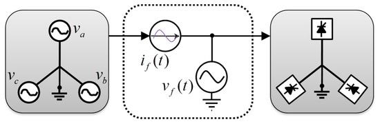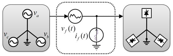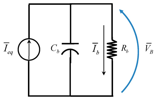 To represent the equivalent voltage in the DC bus (), the bidirectional three-phase inverter will be considered as a current source () that feeds the circuit in the DC side of the same inverter, and with a current value equal to the average value of the load current , as illustrated in Figure 8.
