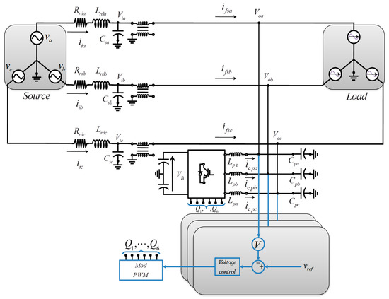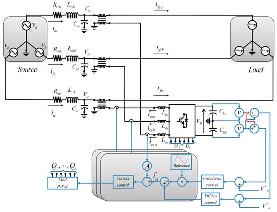 The simplified circuit in Figure 4 represents the series APF of the UPQC. Additionally to the terms defined in Section 1 for Figure 1, , , and are voltages in the power grid between the series compensator and the network for phases a, b, and c, respectively; , , and are the power grid capacitance of phases a, b, and c, respectively; and , , and are the filtered currents supplied to the load using the series APF. Moreover, are the duty cycles for the three-phase inverter; is a reference for the unbalance voltage between the two DC capacitors; is a reference for the DC link voltage; and is a reference for the current supplied by the series APF.