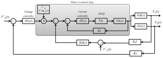 With Equations (10) and (11), the transfer function that relates the voltage in the DC bus to the peak of the input current in the inverter is obtained, as shown in Equation (12). For the voltage mesh, this current is seen as a low-frequency component, for this reason, it is considered as a sinusoidal component, in the following way: