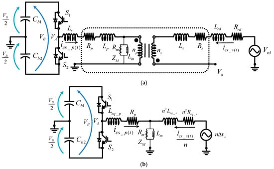 Herein, is the magnetizing resistance, is the magnetizing inductance, is the equivalent resistance in the secondary of the transformer, is the equivalent inductance in the secondary of the transformer, is the equivalent inductance in the primary of the transformer, and is the primary scattering resistors of the transformer.